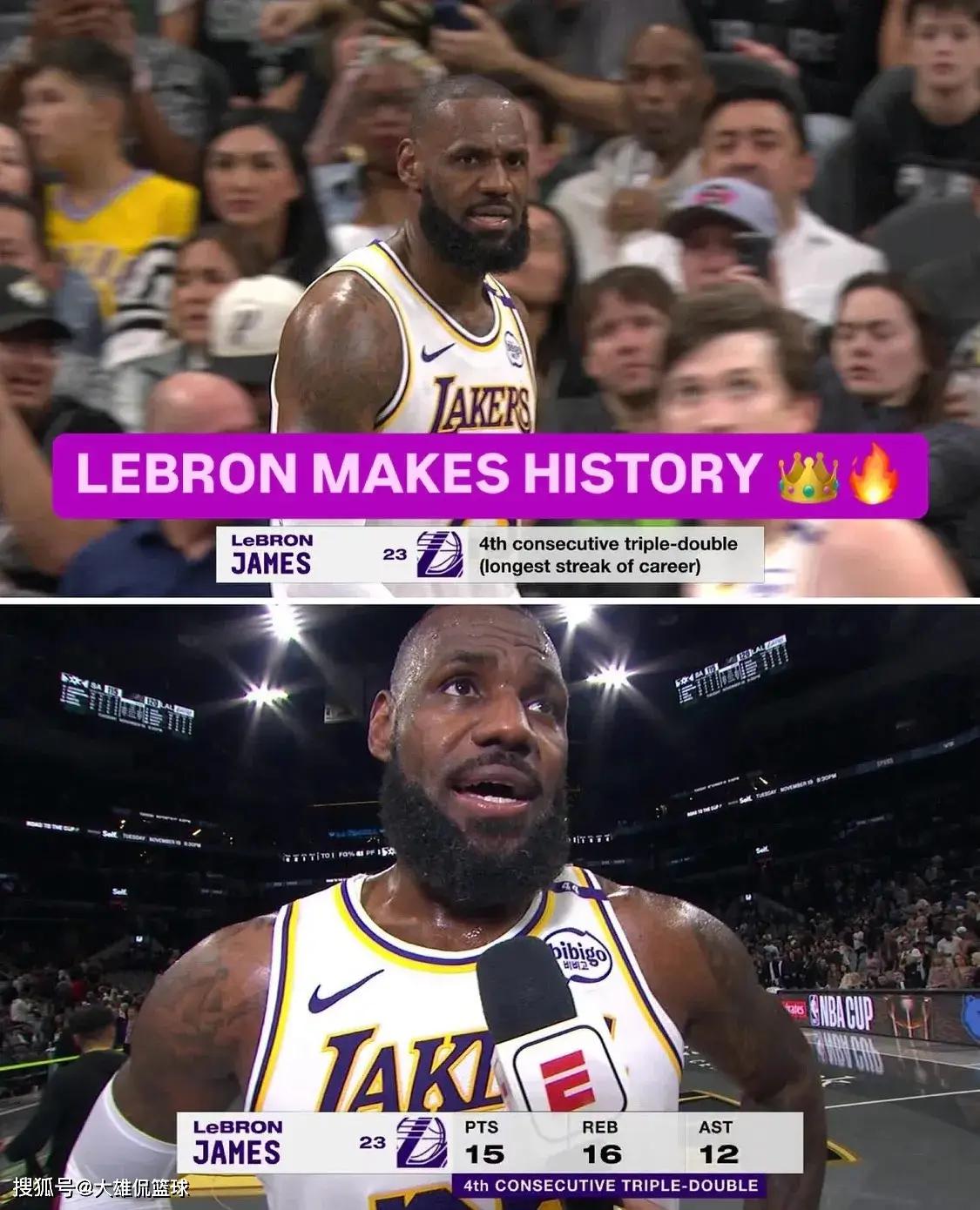 这场比赛拿下三双之后,是勒布朗詹姆斯职业生涯首次连续四场比赛完成这样的壮举。面对自己出色的表现,勒布朗詹姆斯赛后,也是点评了自己的表现。