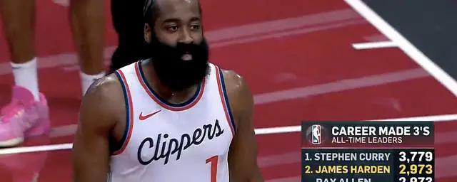 首节比赛,哈登在外线展现出高效火力,单节三分6中3,并且全部是高难度的投篮。至此,哈登的生涯三分命中数增至2973个,与雷阿伦并列NBA历史第二,成功追平了雷神的记录。