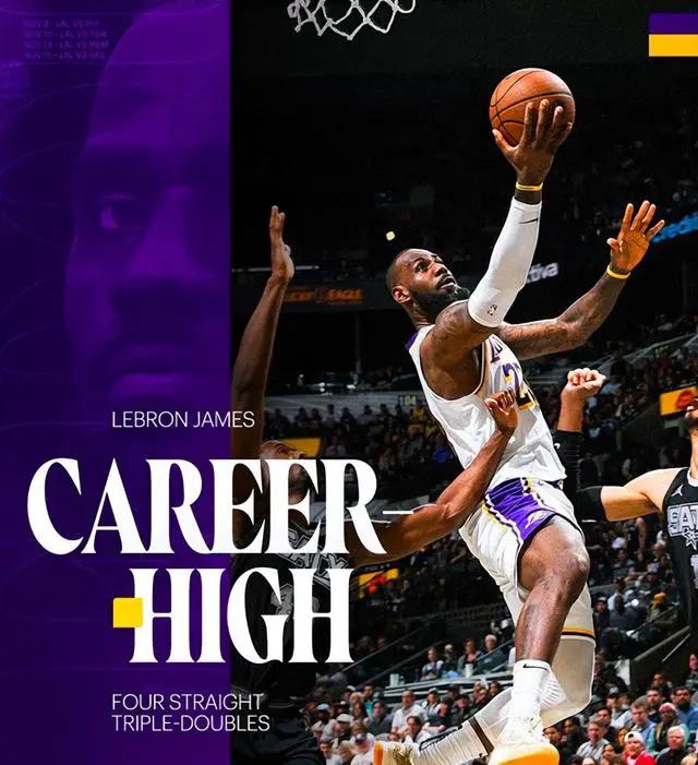 首先是洛杉矶湖人对阵圣安东尼奥马刺的激烈比拼。第三节进行到一半时,詹姆斯在底线罚球后成功助攻里弗斯,帮助湖人锁定本场比赛的三双表现。令人瞩目的是,这已经是詹姆斯连续四场比赛取得三双,再次刷新了NBA年龄最大纪录。