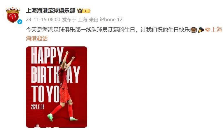 还真是巧了!18强赛第6轮国足主场对阵日本队11月19日的这一天,就刚好撞上了武磊的生日。这天一大早,上海海港足球俱乐部就在俱乐部官微上发动态祝贺(下图),上面写道:“今天是海港足球俱乐部一线队球员武磊的生日,让我们祝他生日快乐??。”配图中是武磊庆祝进球的动作。