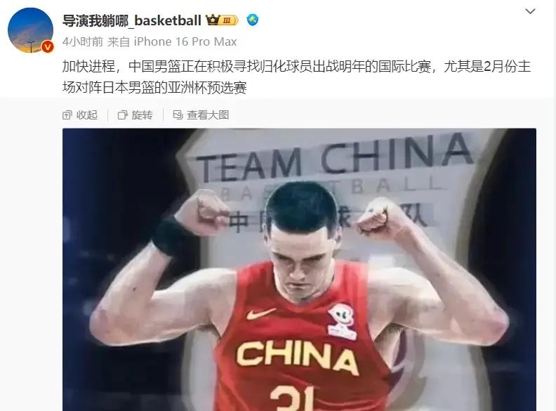据辽宁自媒体人“导演我躺哪”爆料,中国男篮正在加速归化进程,“加快进程,中国男篮正在积极寻找归化球员出战明年的国际比赛,尤其是2月份主场对阵日本男篮的亚洲杯预选赛。”