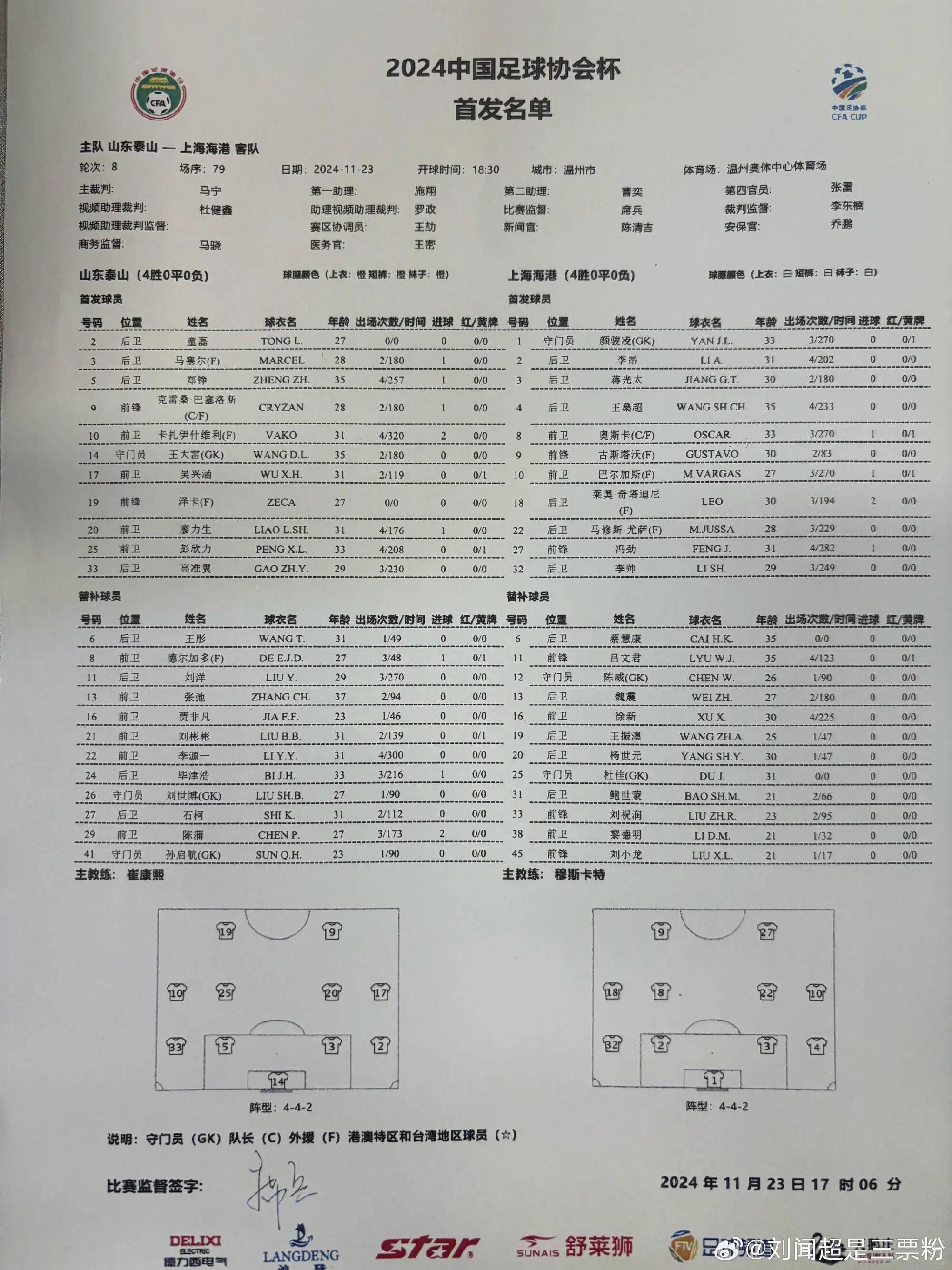 山东泰山首发:14-王大雷、2-童磊、3-马塞尔(F)5-郑铮、33-高准翼、20-廖力生、25-彭欣力、17-吴兴涵、9-克雷桑(F)、10-卡扎伊什维利(F)、19-泽卡(F)