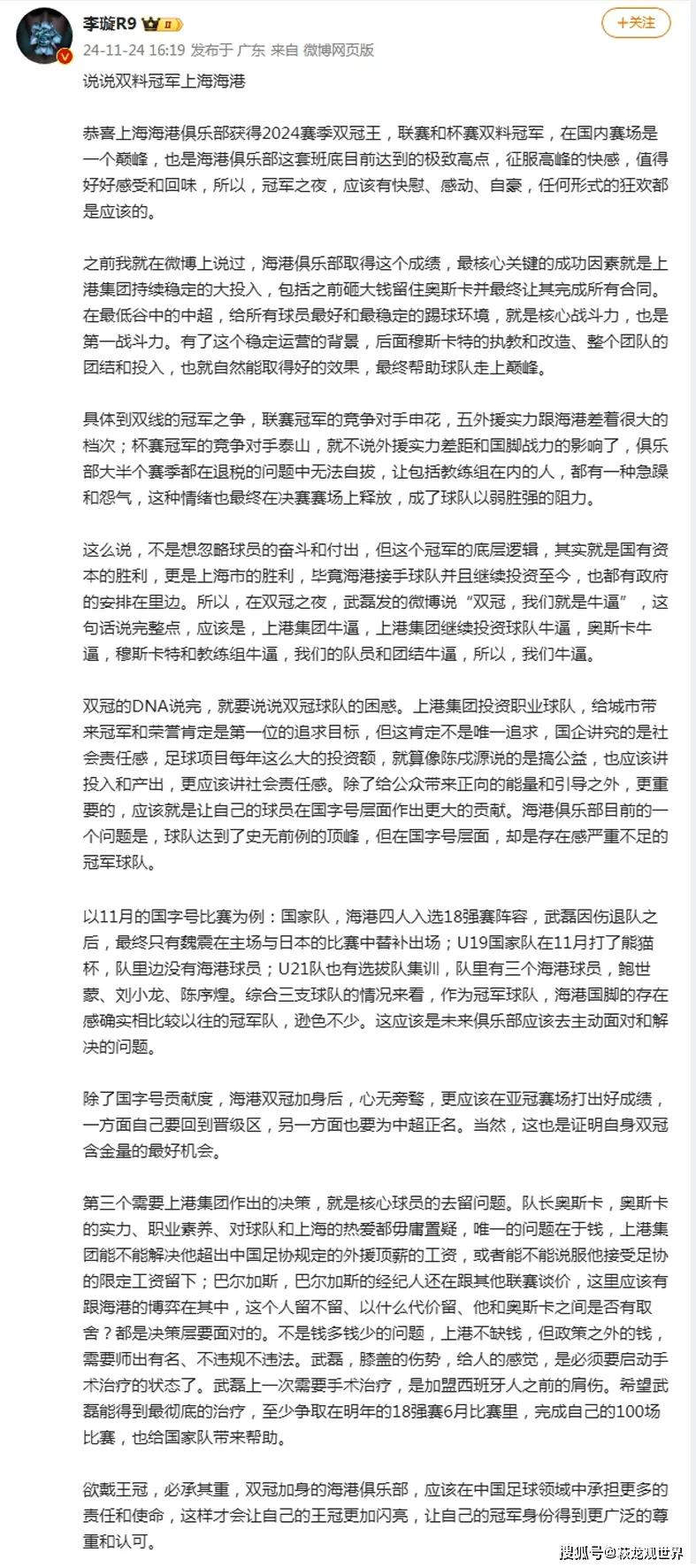 11月24日,足球报主任李璇在微博撰长文评论海港,其中写道:“海港俱乐部取得这个成绩,最核心关键的成功因素就是上港集团持续稳定的大投入,包括之前砸大钱留住奥斯卡并最终让其完成所有合同。”“海港俱乐部目前的一个问题是,球队达到了史无前例的顶峰,但在国字号层面,却是存在感严重不足的冠军球队。”“除了国字号贡献度,海港双冠加身后,心无旁骛,更应该在亚冠赛场打出好成绩,一方面自己要回到晋级区,另一方面也要为中超正名。”