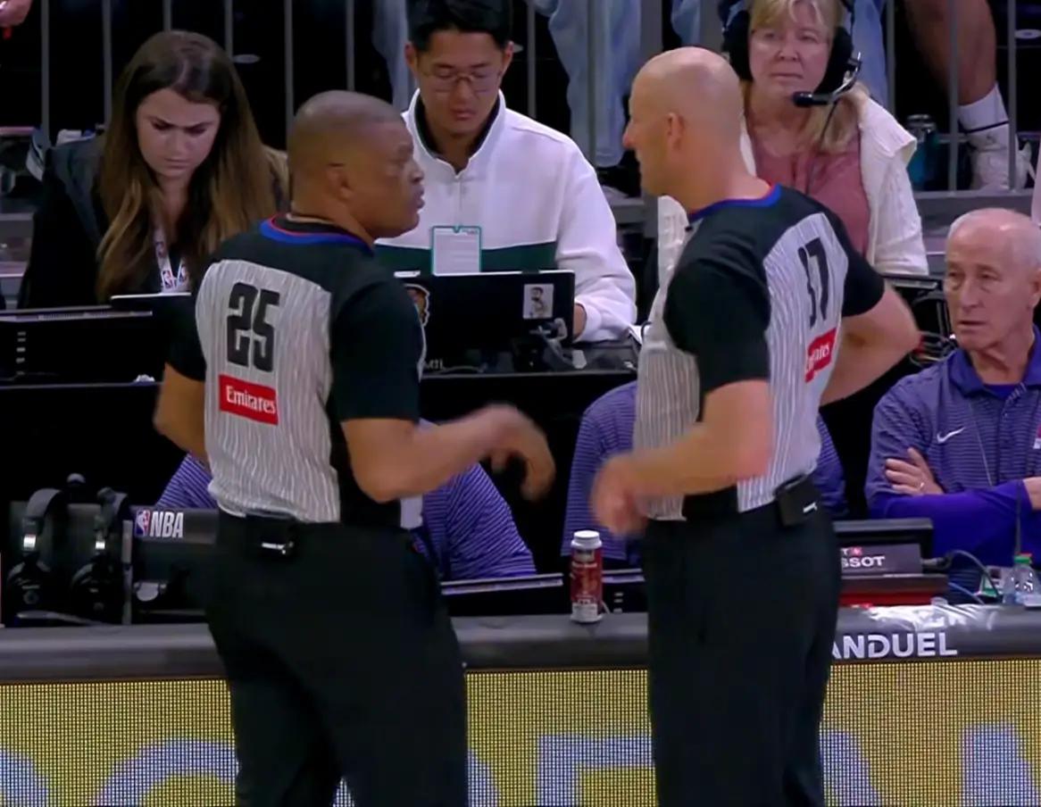 当时比赛第4节开打之后,两边球员都在热身准备上场了,裁判却突然开始走到场边看录像回放,这一看就是5分钟的时间,双方被迫等到身体都等凉了。而看完了回放,他们突然示意太阳队的阿伦去罚球,而且还得罚两个,两罚全中。