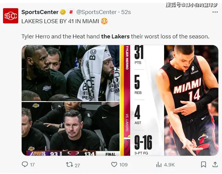 北京时间12月5日,湖人93-134惨败热火吞下二连败。这场比赛湖人在第三节崩盘,泰勒-希罗一人单节7个三分球直接射穿湖人防线,雷迪克不管是限制热火的内线还是外线都不成功,这是一场巨大的失利。