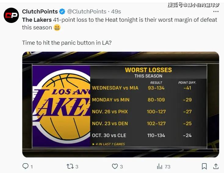 本赛季湖人净负24分以上的比赛已经达到5场,净负41分是本赛季最多。