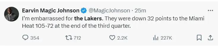 魔术师约翰逊:我为湖人感到尴尬,第三节打完时他们已经落后热火32分。