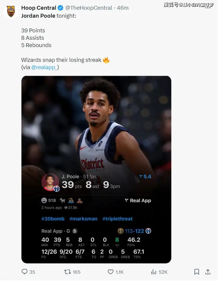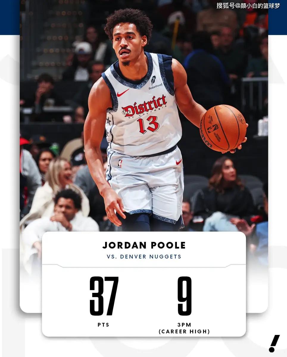 普尔这场比赛是奇才的第一功臣,全场比赛40分钟,26中12,三分20中9,拿到39分8助攻5篮板6失误,真实命中率67.1%,普尔9个三分创造职业生涯新高。