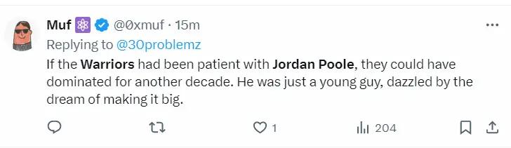 勇士球迷:勇士队太心急了,如果他们不交易掉普尔,他们本可以继续统治联盟下一个10年。他们被预想的成功冲昏了脑壳。