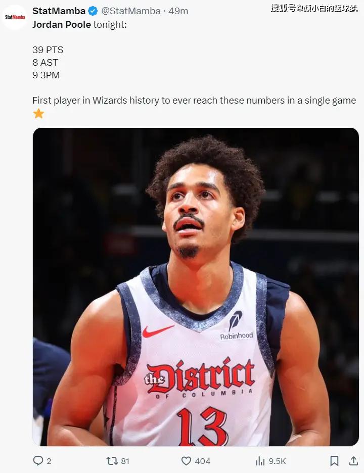 普尔也成为奇才队史第一个,单场至少39分8助攻9个三分球的球员,此役后普尔本赛季数据提升到场均21分5.1助攻2.3篮板1.68抢断0.42盖帽,命中率44.3%,三分命中率41.2%,他转型打一号位后攻防两端的表现都还行。