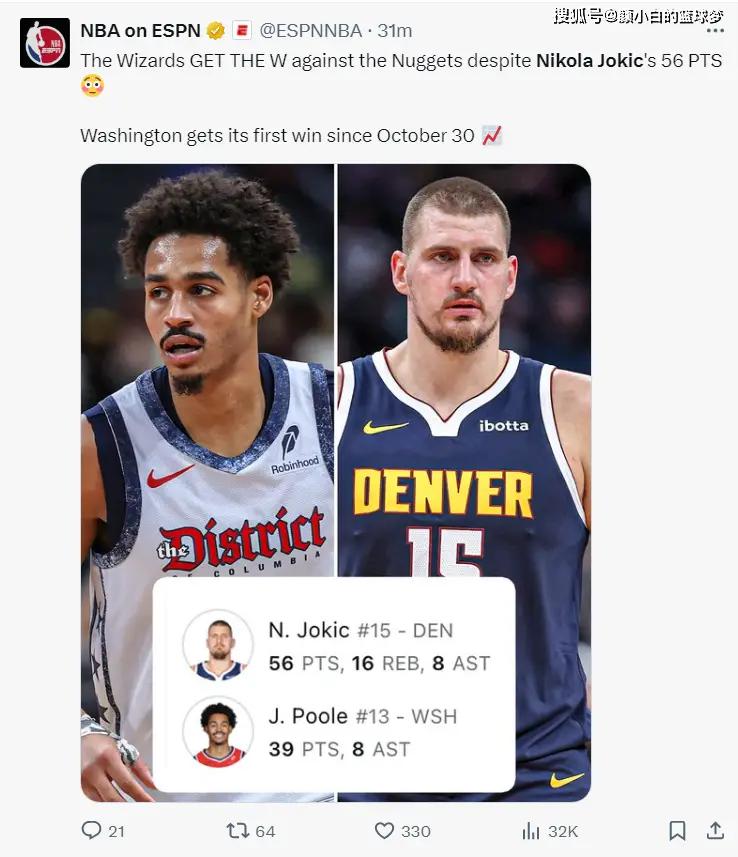 尼古拉-约基奇狂轰56+16+8还是输了,乔丹-普尔也轰下39分8助攻9个三分,这场对轰大战约老师双拳难敌四手,奇才这边三人20+,而掘金只有约基奇一人20+,奇才结束了漫长的16连败,获得赛季第三场胜利。