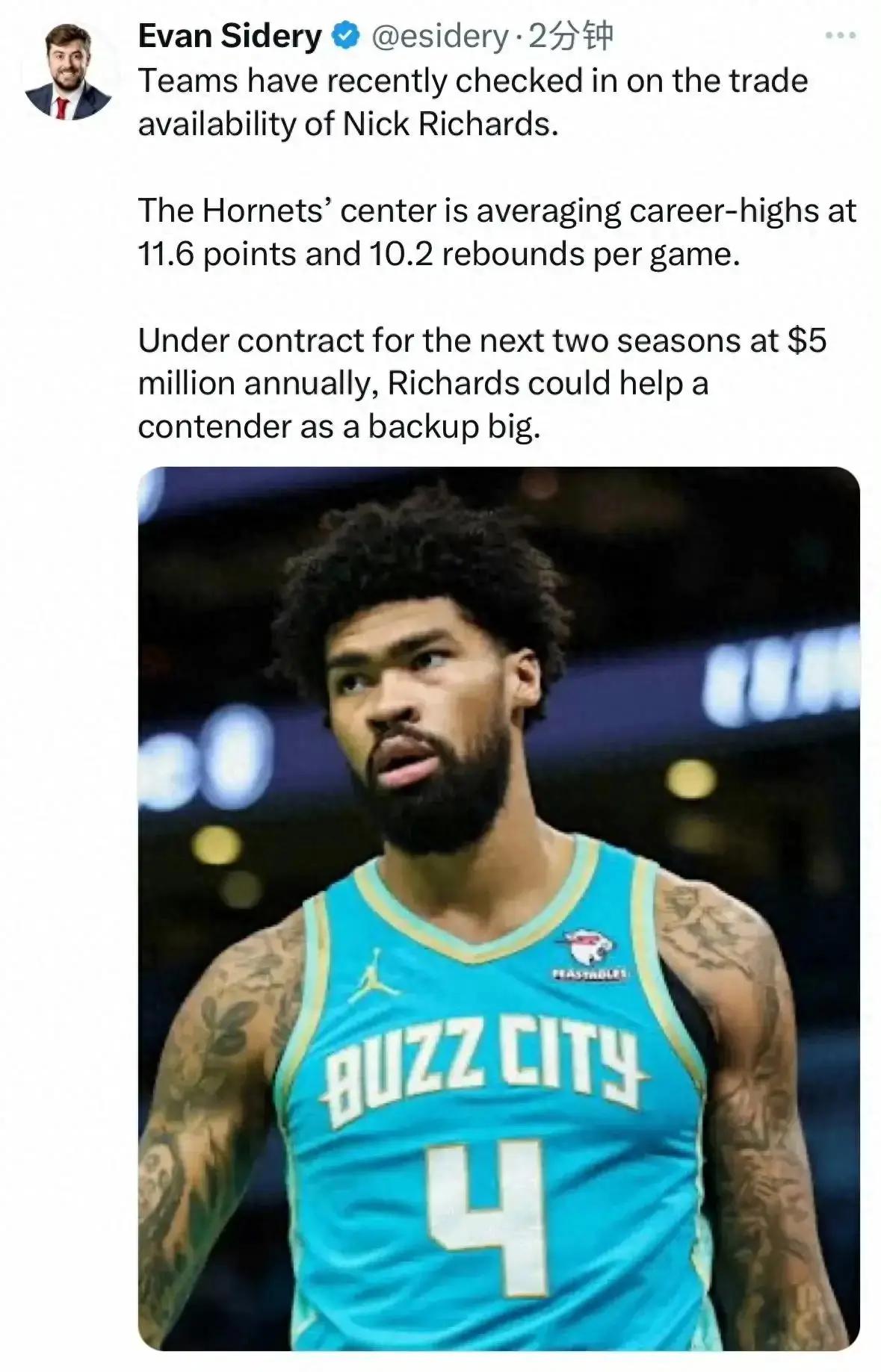 第一笔交易模拟:勇士用波杰 TJD换黄蜂的理查茨升级中锋位置。黄蜂对外要价至少两个次轮,勇士给的这个筹码远远高于两个次轮,波杰这赛季虽然打的不好,但放到弱队里没有战绩压力,很可能成为三球稳定的替补,TJD和理查茨的打球风格也很像,双方各求所需。