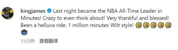 北京时间12月21日,湖人超级球星勒布朗·詹姆斯在个人社交媒体平台上晒出了一张幽默又具有纪念意义的照片。照片中,詹姆斯手举一张纸,纸上写着“10亿分钟”,并配文:“昨晚成为了NBA历史上场时间第一的球员。想想就觉得疯狂,一路走来非常感激,也很感恩。100万分钟,威尔特-张伯伦风格!”虽然这只是一个玩笑式的庆祝,但背后彰显了詹姆斯职业生涯的伟大成就。