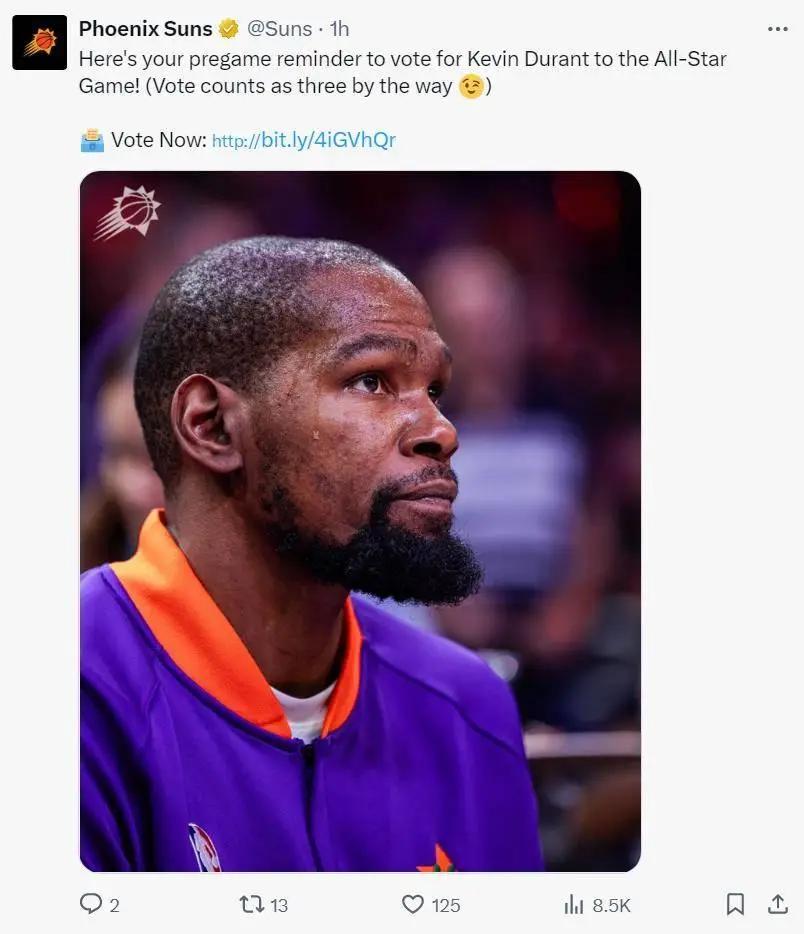 太阳官方在为杜兰特拉全明星选票,毕竟太阳在场时太阳13胜3负,KD就是太阳的赢球利器。首节太阳全队手感拉胯单节只有26分,可KD一人6中4+罚球3中3拿到11分1篮板1助攻。