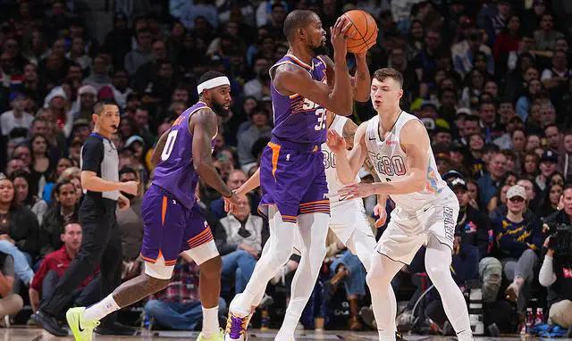 下半场,杜兰特手感稍显下降,比尔表现突出,但掘金防守强劲限制太阳。第三节约基奇独揽13分,带领掘金45分攻势,拉开分差。