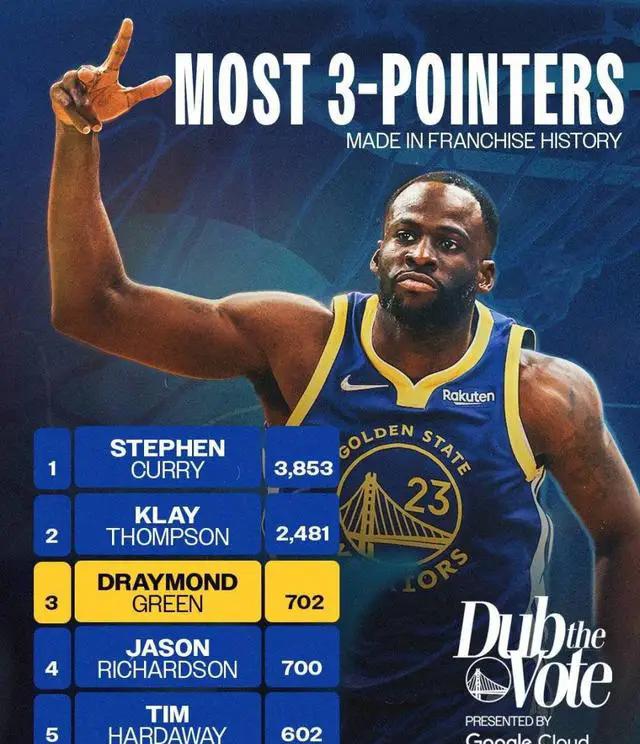追梦格林的职业生涯三分球命中总数已达702个,超过了贾森·理查德森,成为勇士队历史上三分球榜第三,仅次于库里和汤普森这两位水花兄弟。