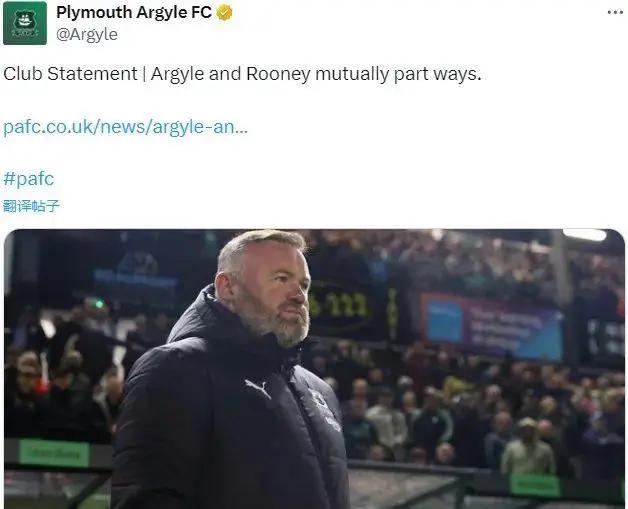 普利茅斯宣布解雇鲁尼,这名曼联传奇仅执教该英冠球队7个月即下课。