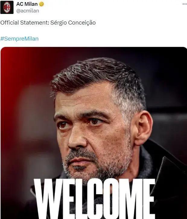 米兰宣布孔塞桑任球队新主帅,解雇了丰塞卡。