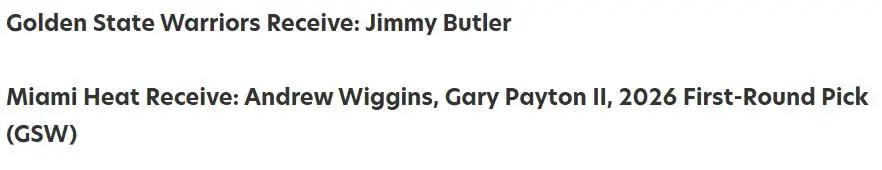 交易2:金州方面将安德鲁-威金斯、加里-佩顿二世和2026年首轮选秀权送到迈阿密热火,以寻求3换1得到吉米-巴特勒!