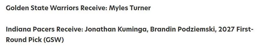 交易1:金州勇士送出乔纳森-库明加、布兰丁-波德齐姆斯基和2027年首轮选秀权到印第安纳步行者,以寻求换来迈尔斯-特纳!