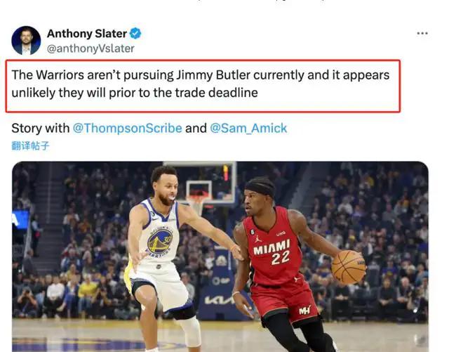 根据记者Anthony Slater的报道,北京时间1月5日指出,目前勇士队并没有考虑追求巴特勒,并且在未来交易截止日期前也不太可能改变态度。