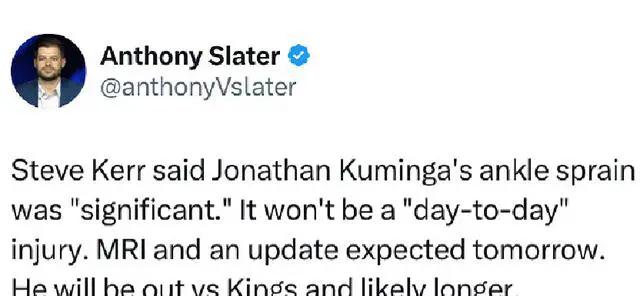 赛后,勇士主帅科尔透露,库明加的脚踝扭伤比较严重,需要接受MRI检查。