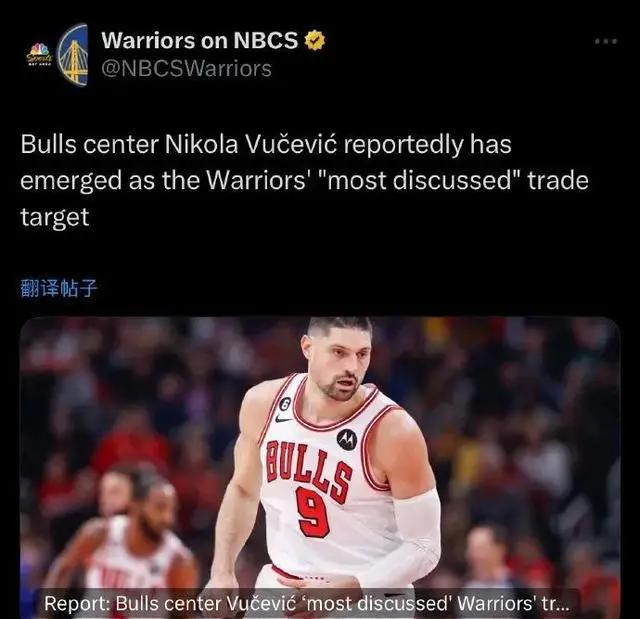 因此,勇士似乎对巴特勒失去了兴趣,开始将目光转向公牛的全明星中锋武切维奇。
