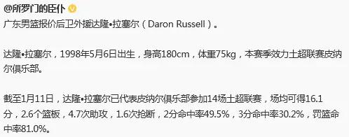 北京时间1月12日,根据据媒体人“所罗门的臣仆”爆料,广东男篮报价后卫外援达隆-拉塞尔。由于戴申-尼克斯目前更多的希望留在NBA为主,这让不少球队需要重新考虑小外援,这就包括广东男篮,随着莱斯被裁后,胡明轩也没有明确的复出时间,徐杰每一场比赛出场时间都超过40分钟存在很大的风险,此时签约小外援就是解决燃眉之急的重要解决办法。