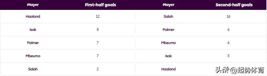 哈兰德以最多非点球进球(15 个)领先,他在早期处于最佳状态。他在英超联赛中打进的 16 个进球中有 12 个是在上半场打进的,其中 10 个是在半小时之前打进的。