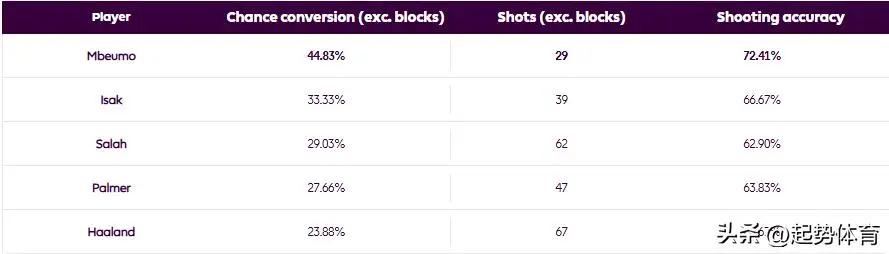 有趣的是,本赛季目前排名前五的球员中,只有两名是中锋。哈兰德和伊萨克是 9 号位的典型代表,而萨拉赫和姆贝莫基本上是右前锋,而帕尔默则扮演 10 号位。