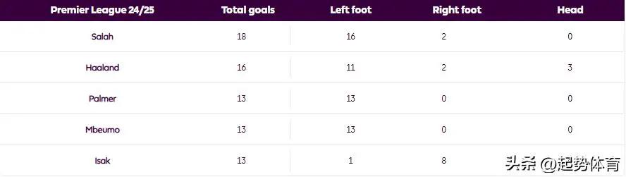 左脚球员在最佳射手的争夺中占据主导地位。罗宾范佩西、萨拉赫和哈兰德是之前仅有的三位获得过该奖项的左脚球员,但就目前情况而言,纽卡斯尔联球星伊萨克是本赛季前五名中唯一的右脚球员。