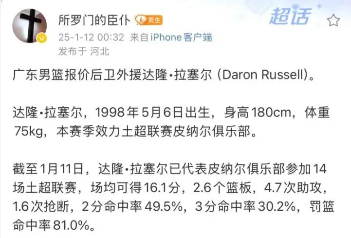 对广东球迷来说,目前最关注的就是球队在外援方面的操作了,朱芳雨什么时候才能为球队签下一名靠谱的小外援。目前这件事终于有了最新的进展,据媒体人“所罗门的臣仆”透露,广东男篮已经对后卫达隆-拉塞尔进行了报价,双方有可能完成签约。拉塞尔是一名身高1米80的小个后卫,之前效力于土耳其的皮纳尔俱乐部,在土超联赛中场均能够得到16.1分2.6个篮板4.7次助攻1.6次抢断的数据。从特点和表现来看,拉塞尔有两大问题,一是身高比较矮,这样的外援很难能够在CBA联赛立足,广东男篮上个赛季签下的沃特斯就是前车之鉴;二是投射能力有些不足,三分球命中率只有30%,这种类型的外援打CBA也会比较困难。对于广东男篮报价拉塞尔的操作,不少球迷都不看好。不过如果他只是作为救火外援的话,应该还是够用的。