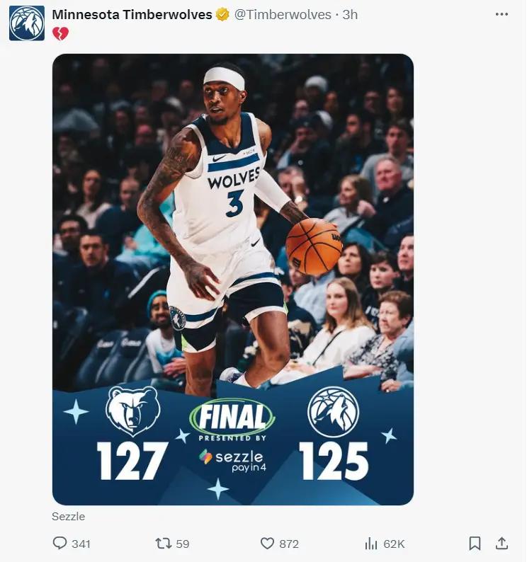终场前4.1秒兰德尔致命失误被小贾伦抢断,莫兰特10英尺的跳投命中灰熊127-125反超。终场前18.1秒芬奇暂停为爱德华兹画了一个绝杀的战术,终场前7.1秒华子三分绝杀不中迪温拼下前场篮板,终场前6.1秒芬奇再叫暂停。