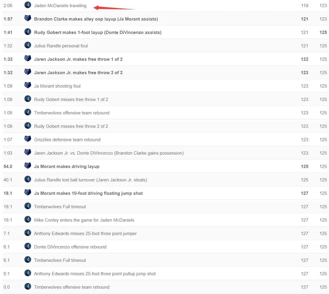 森林狼这场比赛关键时刻崩盘的令人匪夷所思,(123-119领先4分)终场前2.06秒麦克丹尼尔斯走步违例失误,随后克拉克接莫兰特分球直插篮下取两分,灰熊追到121-123。