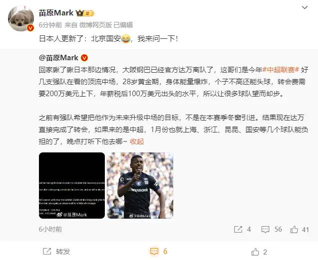 在达万离队的消息官宣之后,日本媒体《体育报知》报道称,达万的下家是中超球队北京国安。随后,苗原跟进确认称,是北京国安签下了达万。对于国安而言,能在冬窗引进达万绝对是一笔重要补强,甚至可以说是补强了球队争冠路上的最后一块拼图。