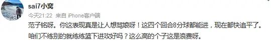 随后也有大量的球迷对于范子铭的竞技状态表达不满点评说道:还有交易的价值吗?别的队都能看见这大软蛋,估计也就中产合同最多了。交易不来好球员。