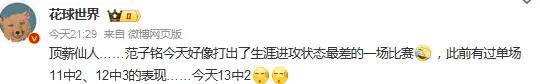 博主“花球世界”点评说道:顶薪仙人范子铭今天好像打出了生涯进攻状态最差的一场比赛,此前有过单场11中2、12中3的表现今天13中2。