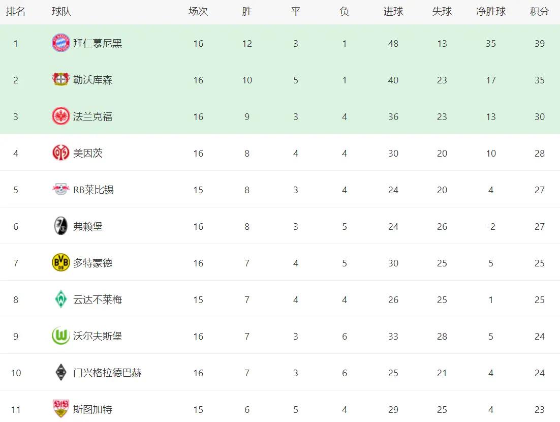 在积分榜上,拜仁依然占据榜首位置,总积分是39分,领先身后的勒沃库森4分。当然,这样的优势也并不大,拜仁不能够掉以轻心。法兰克福以30分排名第3,落后拜仁太多,基本退出了冠军的争夺。美因茨以28分排名第4。莱比锡27分排名第5。弗赖堡也是27分,排名第6。多特蒙德只拿到25分,排名第7。