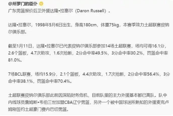 根据报道,广东男篮选择后卫达隆拉塞尔,也是效力于皮纳尔俱乐部。拉塞尔是1998年出生的,身高180公分,体重75公斤,本赛季,拉塞尔在皮纳尔俱乐部效力了14场比赛,场均可以拿到16.1分2.6篮板4.7助攻,他的投篮命中率是49.5%,三分球命中率30.2%。不过在7场BCL的比赛中,拉塞尔场均可以拿到15.9分、2.1篮板4.4助攻、1.7抢断,拉塞尔的投篮命中率56.4%,三分球命中率38.1%,拉塞尔也是被认为是广东男篮此前的波多黎各外援水哥的加强版,毕竟拉塞尔180公分的身高在CBA会比水哥更加有竞争力。