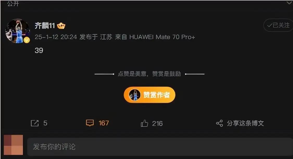 本场比赛手感本就不理想的齐麟,在第三节刚开始不久因为抱怨裁判被吹罚技术犯规,随后直接返回更衣室(新疆误以为齐麟被吹两次技犯就让他返回了更衣室),退场后,齐麟更新个人社交媒体,发了一个“39”暗指本场比赛的39号裁判杨宏峰。