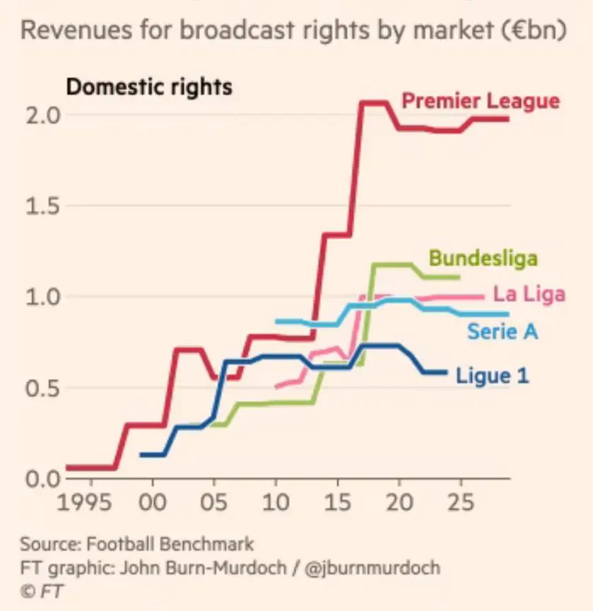 逻辑顺理成章:正是通过那块或大或小的屏幕,足球才得以超越场地的局限,把每场比赛的受众提升好几个数量级。触达最多消费者的渠道,自然也应该贡献最多的收入来源。