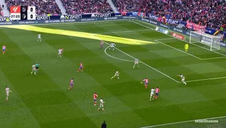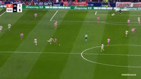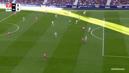 第70分钟,格列兹曼分边,西蒙尼射门被破坏!