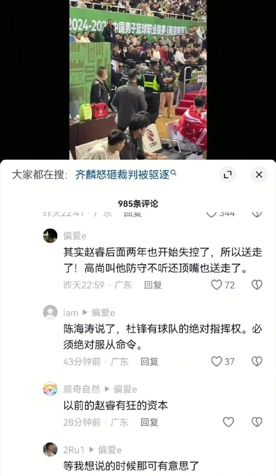 赵睿的态度也让很多球迷认为赵睿是被逼着离开广东队的,甚至赵睿的离开是有隐情的,近期,齐麟怒砸裁判被驱逐之后,有球迷在评论区谈论这件事情的时候,也是波及到赵睿。该球迷表示:“其实赵睿后面两年也开始失控了(情绪),所以送走了,高尚叫他防守不听还顶嘴也被送走了。”随后有球迷表示:“陈海涛说了,杜锋有球队的绝对指挥权,必须绝对服从命令。”