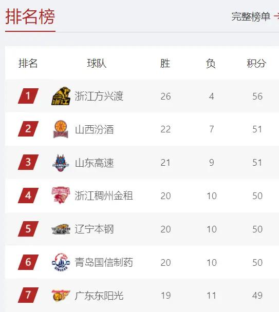卫冕冠军辽宁队,目前的战绩与浙江队一样,同为20胜10负,球队排名也从上一轮的积分榜第三名,下滑到积分榜第5名。辽宁队身后的青岛队,他们的战绩和辽宁也一样,也是20胜10负。可以说,目前与辽宁队竞争的对手还真不少。积分榜第7位则属于广东队,11冠王最近状态不错,以19胜11负的战绩,稳居积分榜第7。北京队这一轮大胜后,他们的战绩变成20胜9负,排在积分榜第8名。
