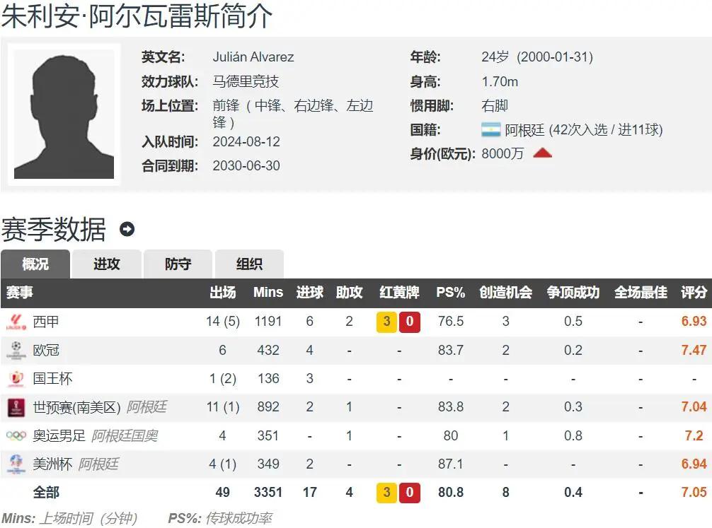 现年24岁的阿尔瓦雷斯,身高1.70米,右脚球员,能踢锋线多个位置,有射术,有远射,也有持球推进的能力,与马竞的合同至2030年,身价8000万欧元。阿尔瓦雷斯本赛季各项赛事共为马竞出场28次,贡献13球2助,合计出场1759分钟,小蜘蛛还是马竞出勤最多的球员。