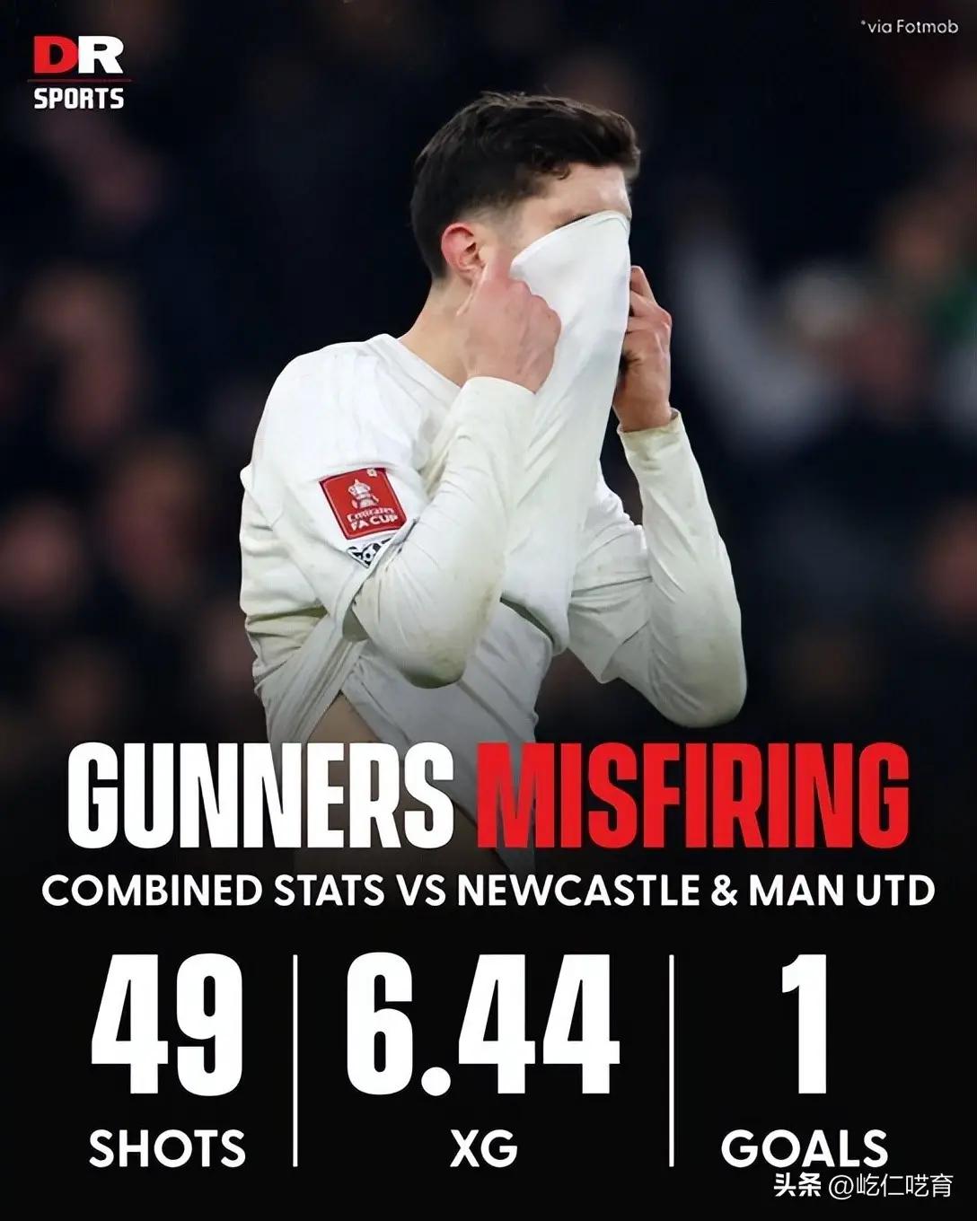 两场杯赛共计49脚射门,预期进球值高达6.44,实际进球仅1粒。而若是再加上联赛第20了客场1-1打平布莱顿的比赛,阿森纳仅三场全面溃败地对决,其综合数据更是惨不忍睹: