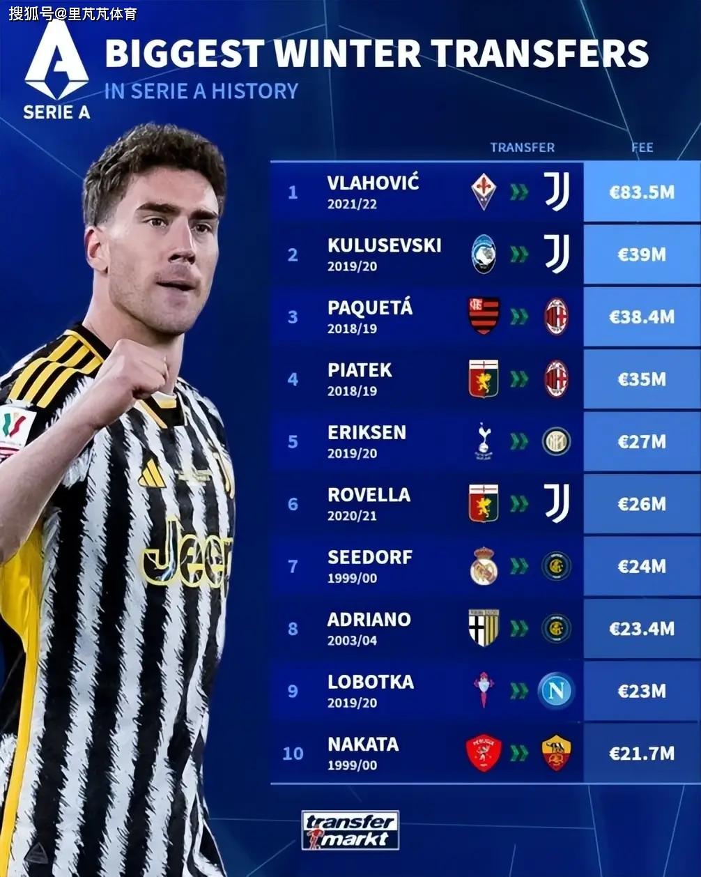 德国转会市场统计了意甲历史上冬窗最贵引援榜单,其中弗拉霍维奇以8350万欧转会费遥遥领先,库卢3900万欧排在第二。