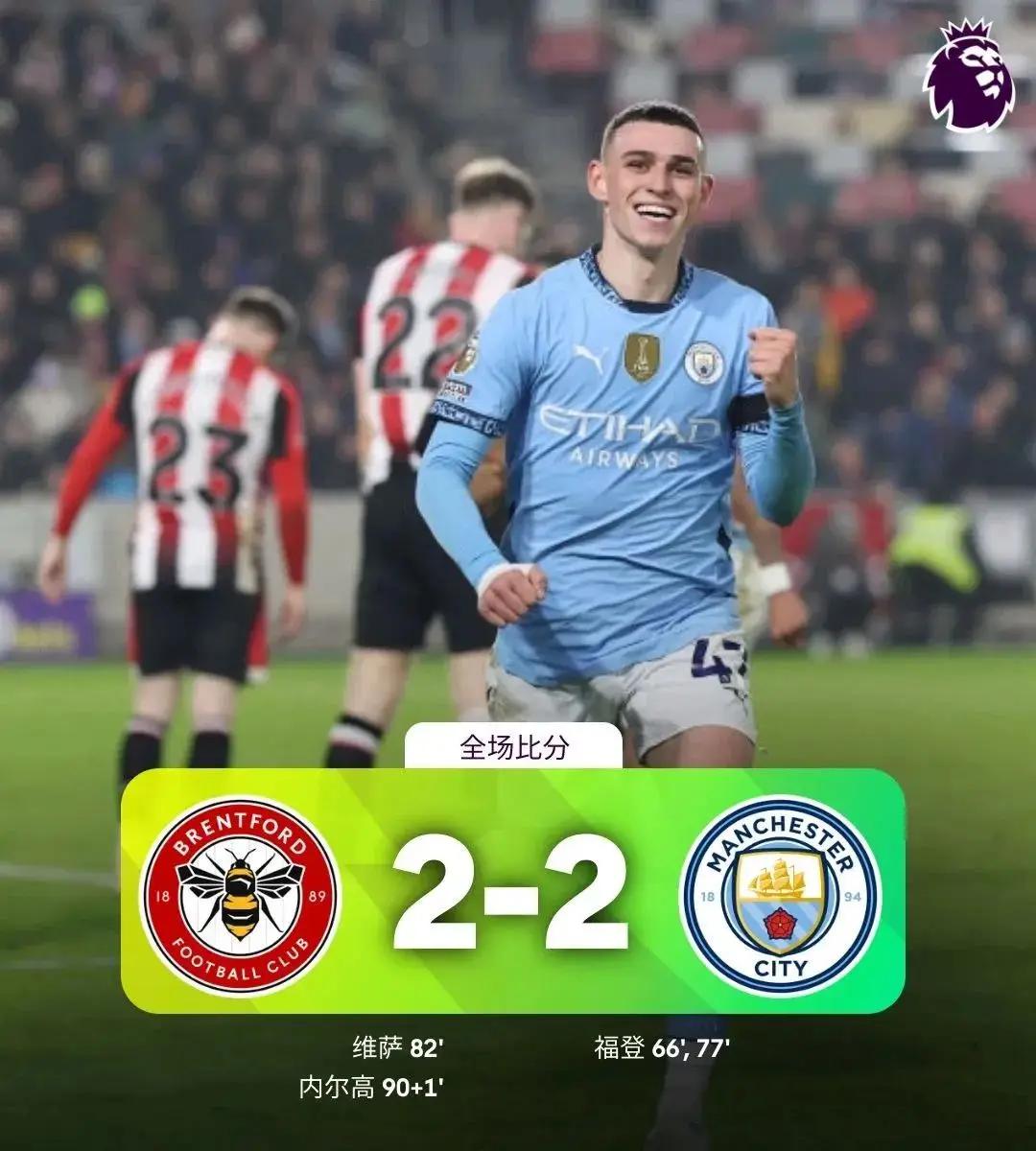 曼城2-0领先未能保住胜局,上赛季英超MVP福登在第66、77分钟梅开二度,德布劳内送助攻。布伦特福德82分钟由维萨扳回一球,内尔高补时头球绝平。