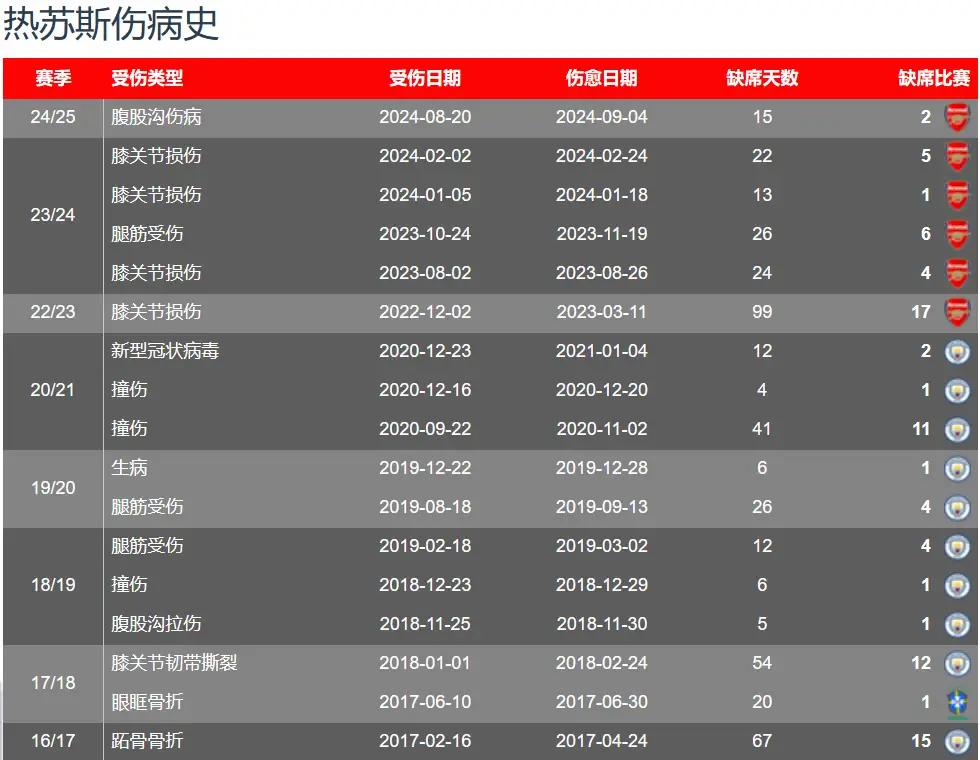 加盟阿森纳两年多时间,热苏斯已先后7次受伤,缺席时间超过420天,至少错过55场比赛。 目前热苏斯身价为4500万欧元。