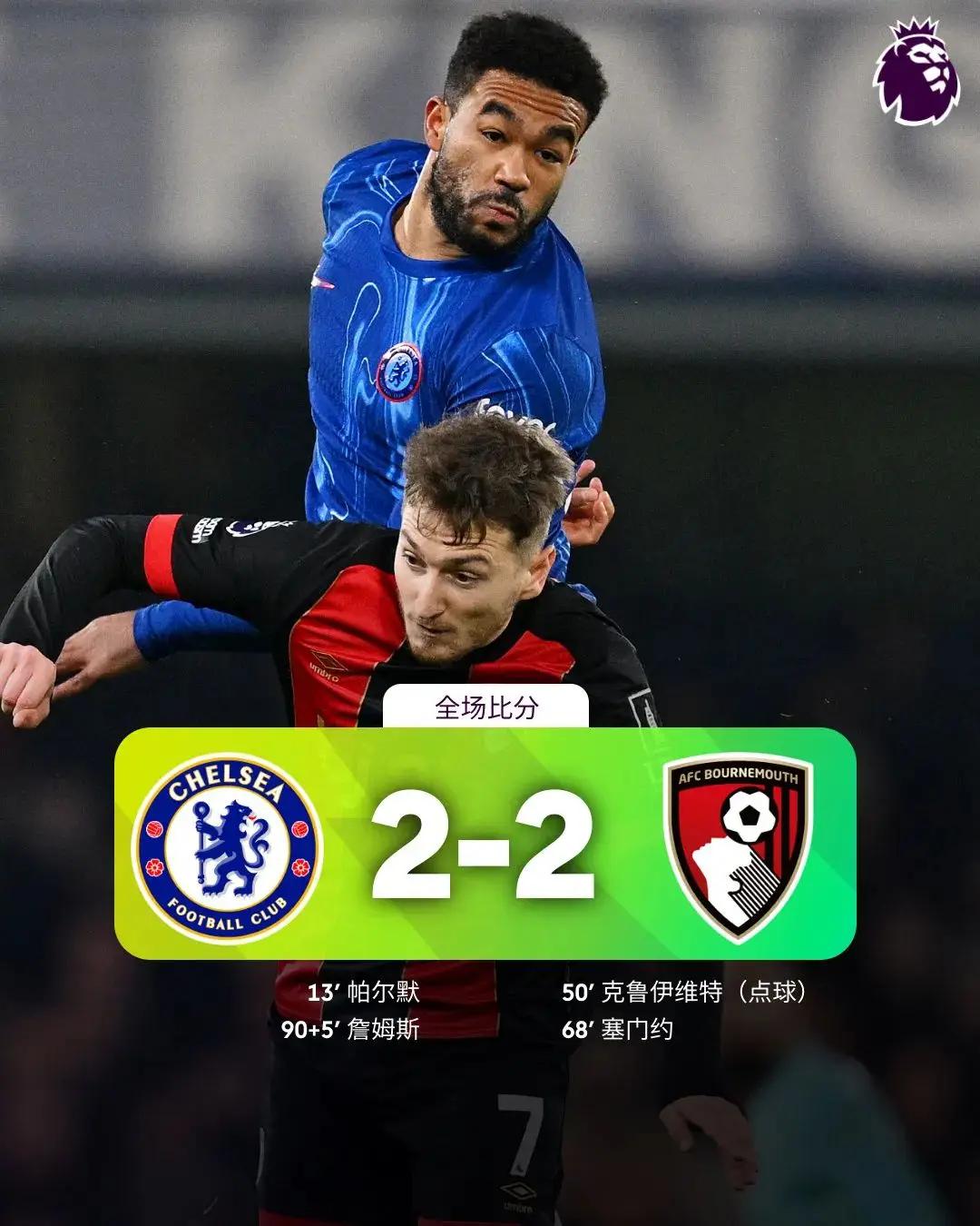 帕尔默13分钟单刀破门,下半场5分钟凯塞多犯规送点,小克鲁伊维特点射扳平,塞门约左脚爆射反超。里斯-詹姆斯95分钟任意球绝平。